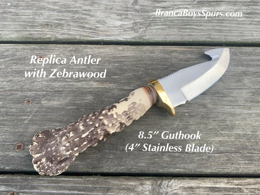 Our Replica Antler handled Big Game Guthook Knife. Hand made in the USA. Features a 4” Stainless Steel Guthook style blade. Great for Deer or Elk. Comes with a Custom Handmade to fit leather sheath.