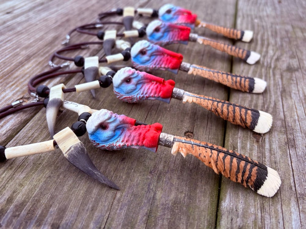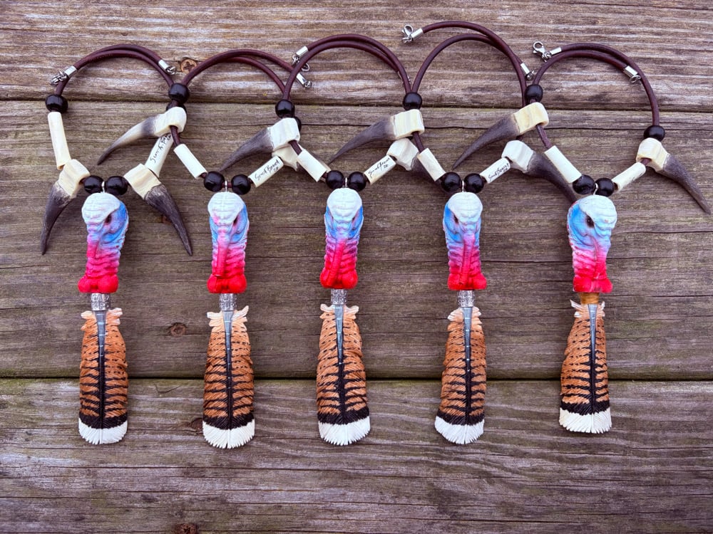 MEGA Boss Rearview Mirror Hang. Hand carved Feather is whitetail Antler. Resin turkey head and beard with Branca Boys Spurs Leg Bands.